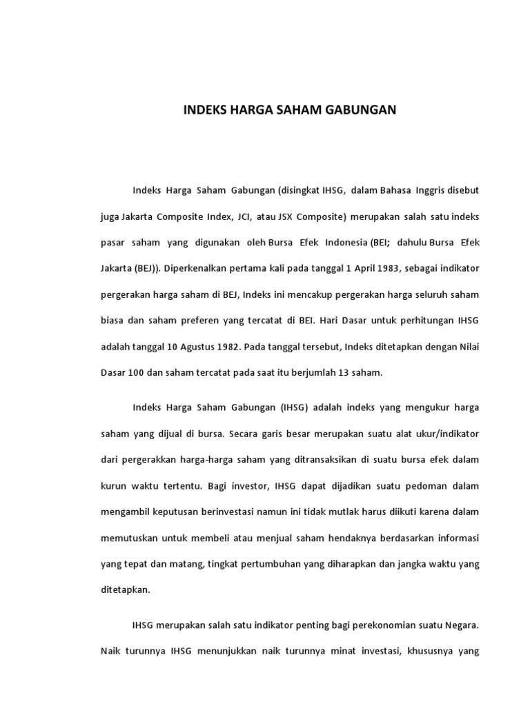 Pergerakan ihsg biasanya jadi acuan banyak investor dalam menentukan langkah investasinya. Dahulu bursa efek jakarta (bej)). Indeks harga saham gabungan (ihsg)yang mengukur pergerakan semua saham yang tercatat di bei.